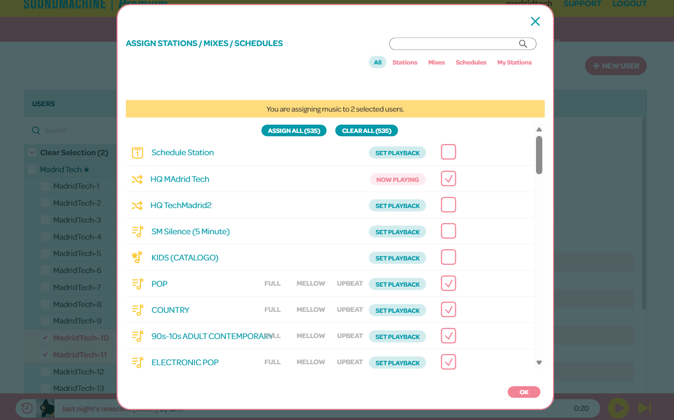 As an administrator, you can assign stations, mixes, or schedules to your users. To do this, go to the Users tab and select the desired users by holding the Shift key. Once selected, click the “Bulk Assign Music” button or "Assign Music" if it's only one account.