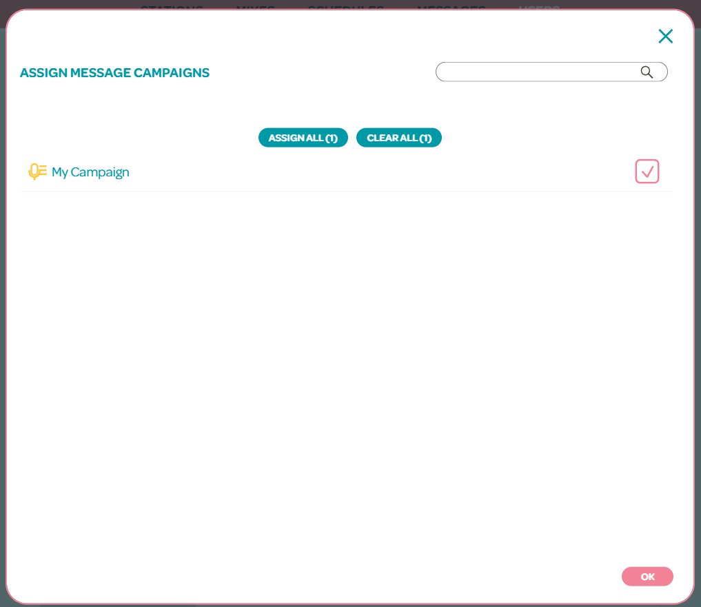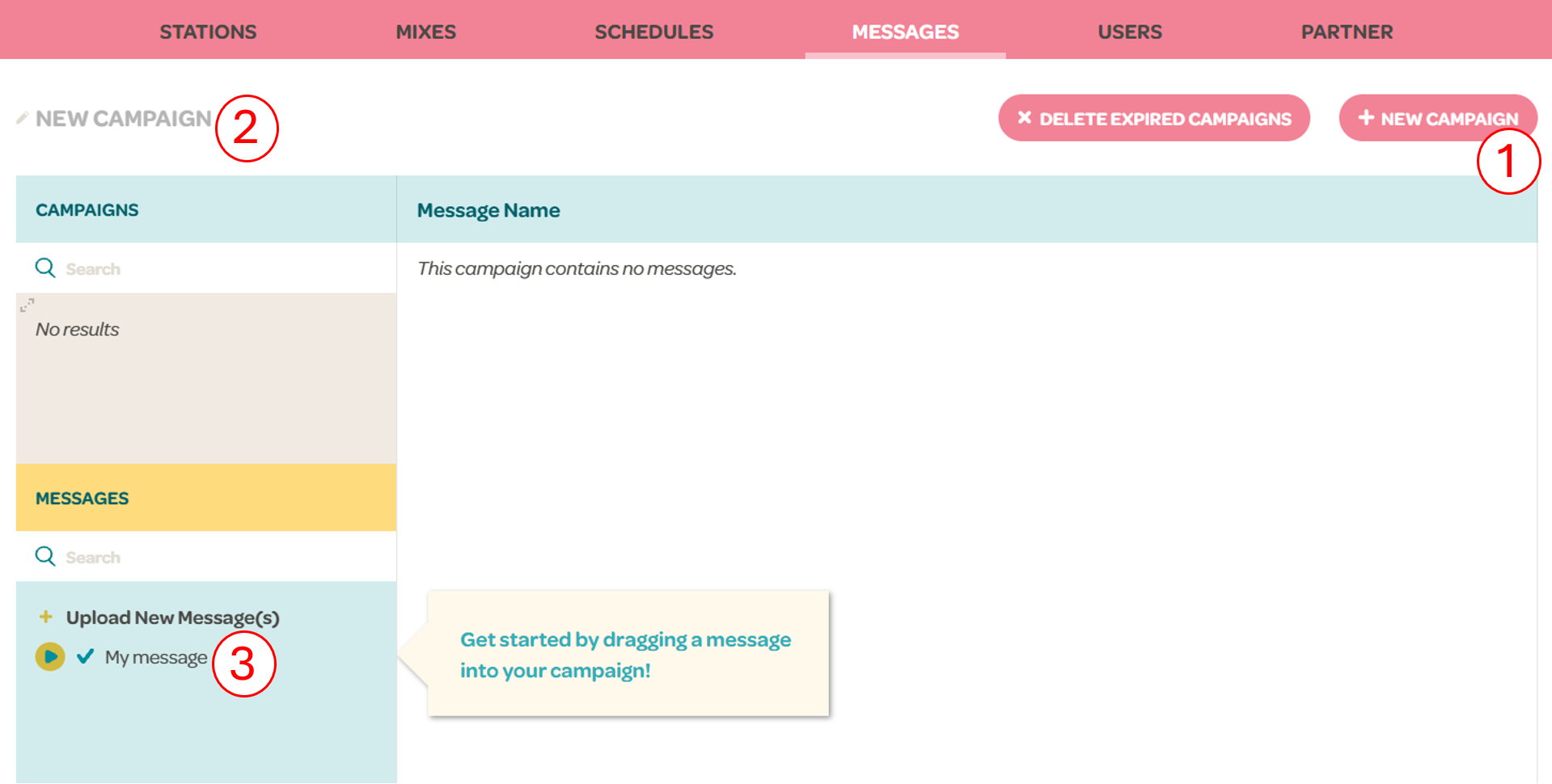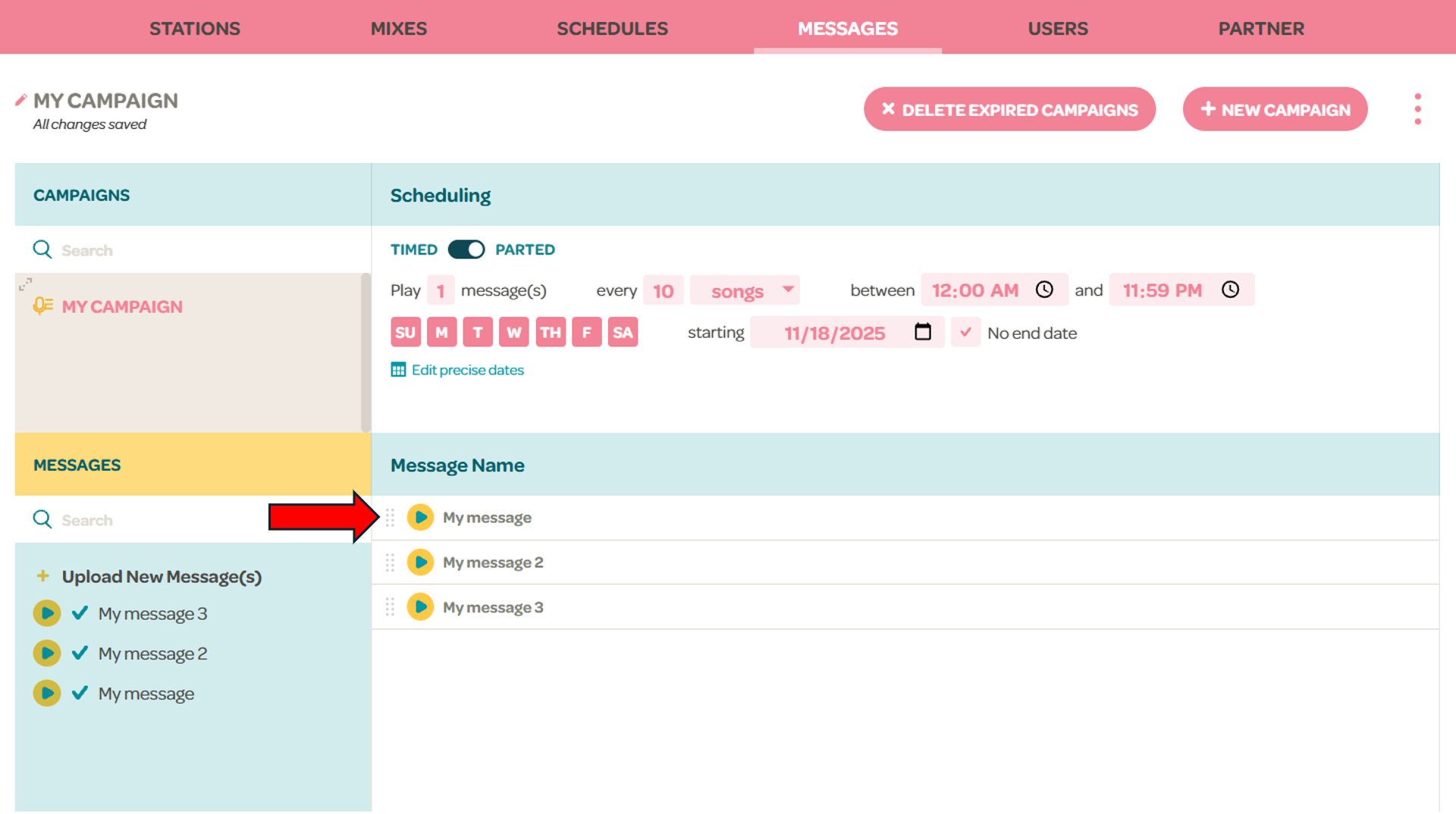Campaigns are a flexible way to schedule playback of your messages. You can easily add or remove messages to your campaigns, and have them play at regular intervals, either by minutes or songs, or at specific time slots.