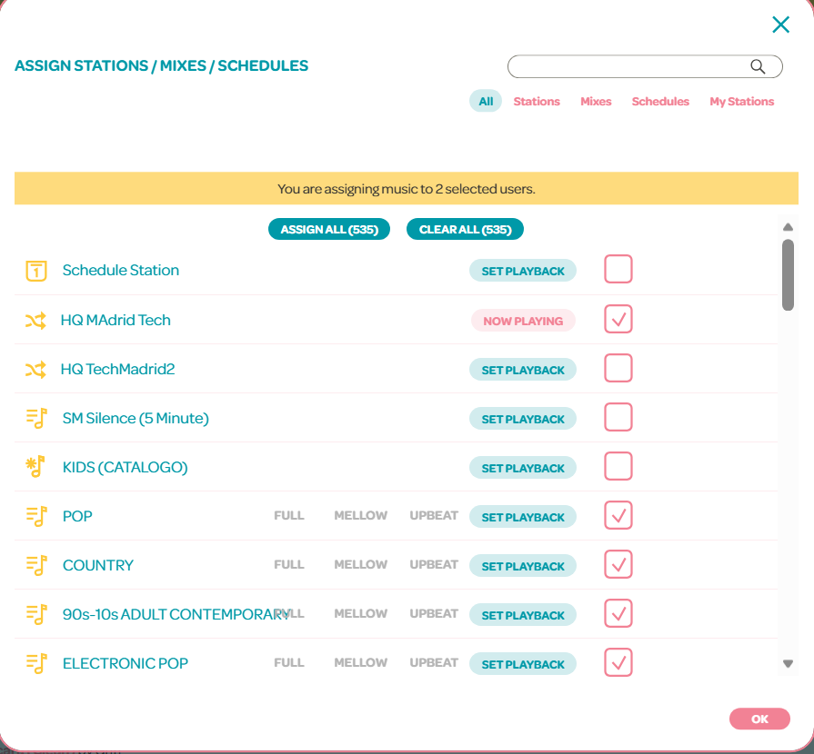 Busca el canal que deseas asignar y marca la casilla junto al canal. Para dispositivos SoundMachine debes pulsar el botón "SET PLAYBACK" y establecerlo "NOW PLAYING" en el canal que querías configurar. Asegúrate de guardar los cambios haciendo clic en "OK". Después de un par de canciones comenzará a reproducirse el nuevo contenido