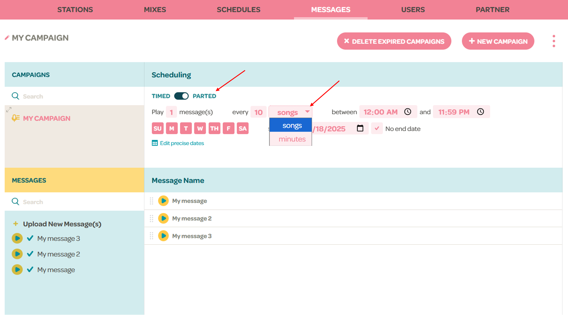 Una campaña configurada para reproducirse cada 10 canciones recorrerá los mensajes al final de cada décima canción.