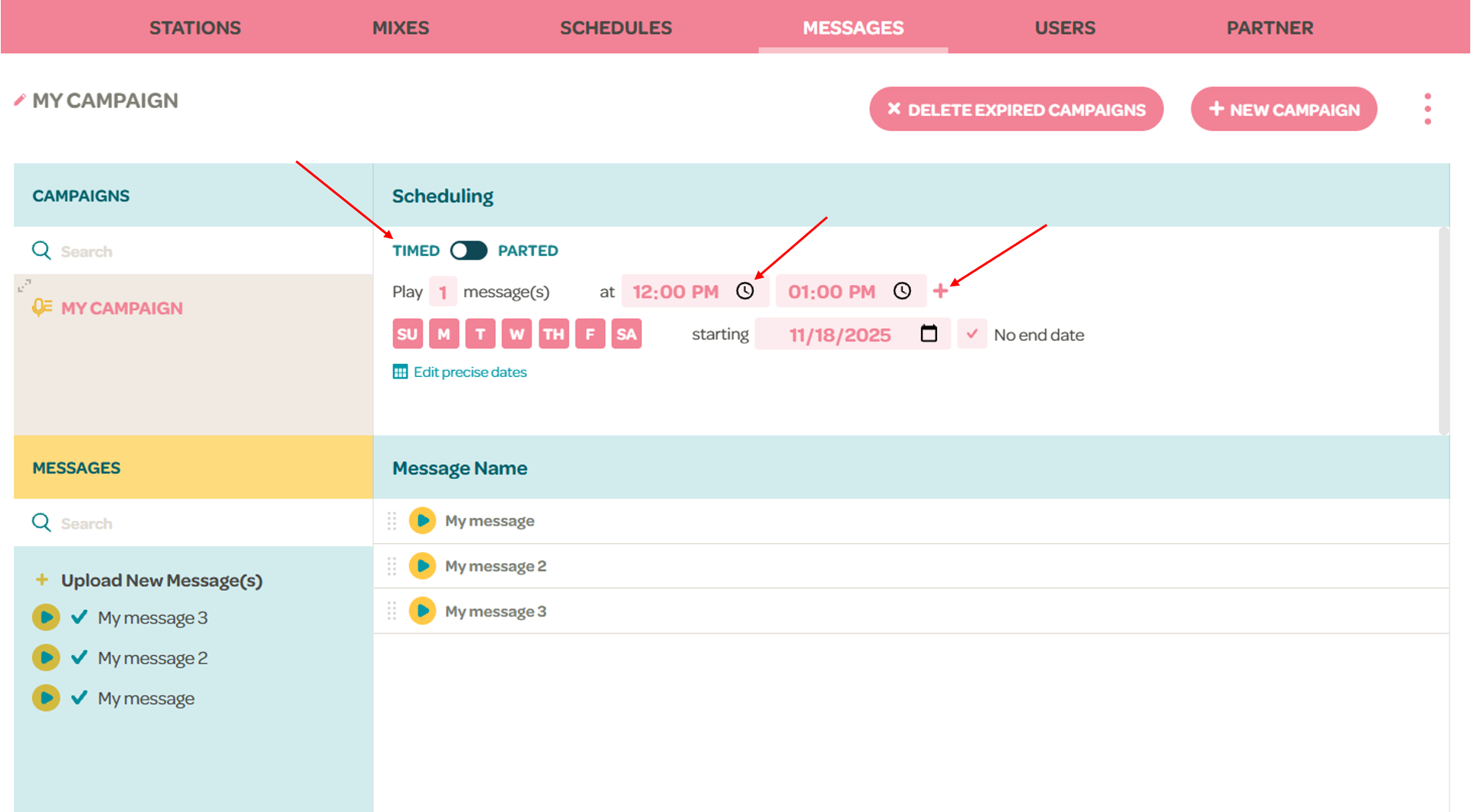Las campañas por hora específica se reproducen en horarios específicos del día e interrumpirán la canción que esté sonando actualmente en el hardware de SoundMachine. El hardware de terceros reproducirá el mensaje lo más cerca posible de la hora programada sin interrumpir una canción (generalmente inmediatamente después de la canción que esté sonando en el momento programado).