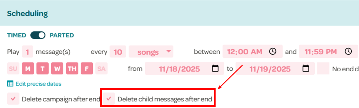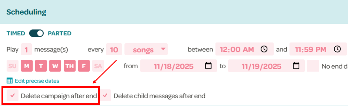 También existe la opción de eliminar la campaña automáticamente después de que finalice, desde la sección de Scheduling. Esto ocurrirá dentro de los 2 días posteriores a que la campaña haya expirado.