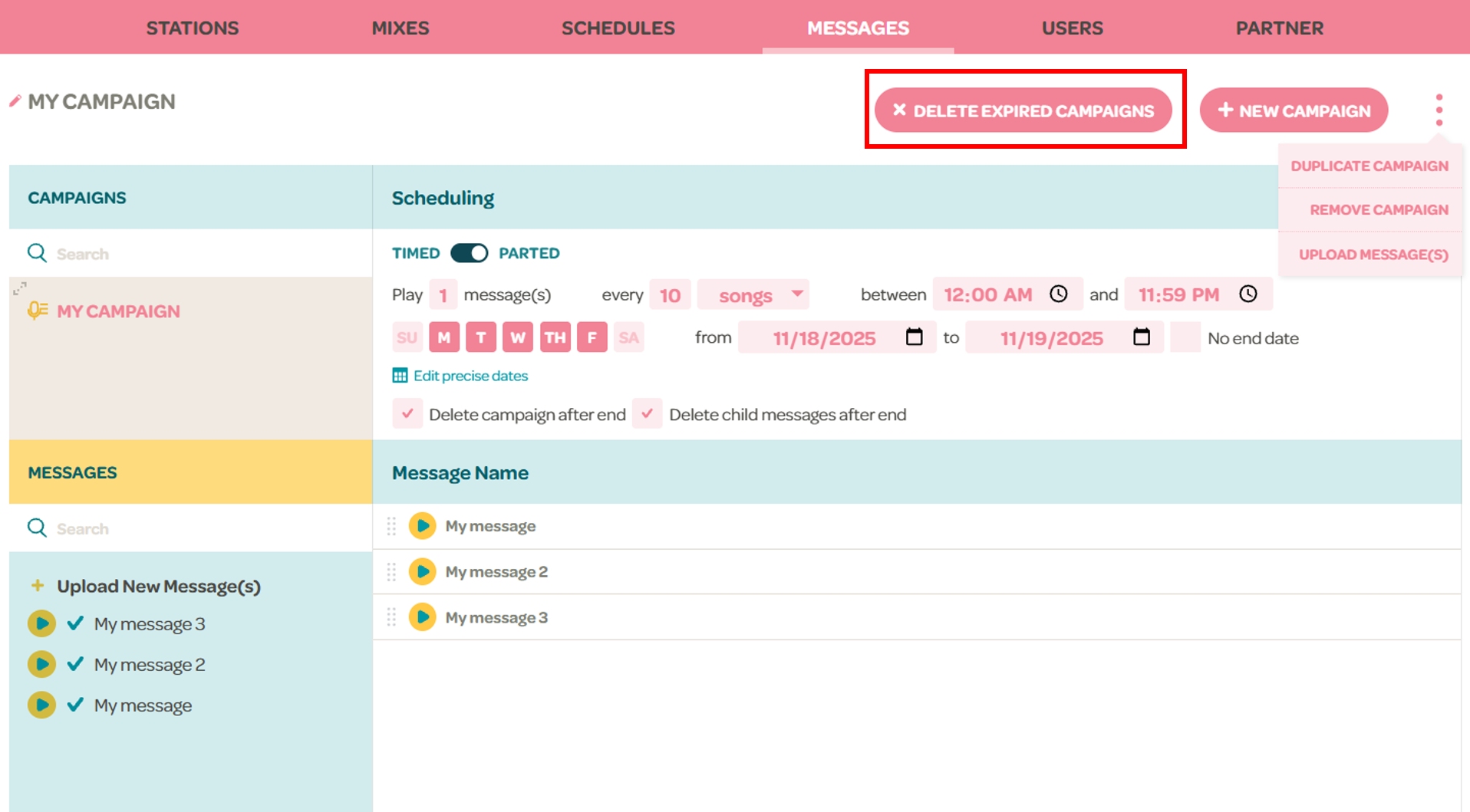 Si una campaña tiene una fecha de finalización, se considerará expirada una vez que esa fecha haya pasado. Puedes hacer clic en el botón “Delete expired campaigns” en la parte superior para eliminar todas las campañas cuya fecha de finalización ya haya pasado.